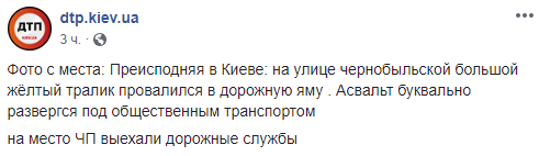На место инцидента выехали дорожные службы. "Преисподняя в Киеве: на улице чернобыльской большой желтый тралик провалился в дорожную яму. Асфальт буквально разверзся под общественным транспортом", - сообщили в паблике.