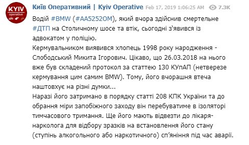 "Киев Оперативный" сообщает, что задержанным водителем BMW (госномер AA5252OM) оказался парень 1998 года рождения - Слободской Никита Игоревич.