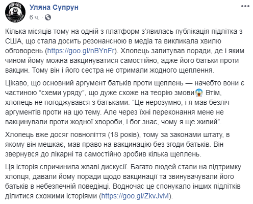 И.о. министра здравоохранения Уляна Супрун рассказала про свое отношение к случаю американского подростка, который при достижении 18-летия решился привиться. Он опубликовал заметку на Reddit и попросил совета, "как это лучше сделать".