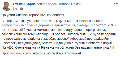 "По информации управления по вопросам гражданской защиты населения Тернопольской областной государственной администрации, сегодня, 17 февраля, в 9.30 часов случился сбой из-за возможного внешнего вмешательства в программном обеспечении системы оповещения области. Информация, которая была передана по проводному радио и в средствах массовой информации о радиационной опасности не отвечает действительности. Радиационная ситуация в области в норме", - отметил чиновник.