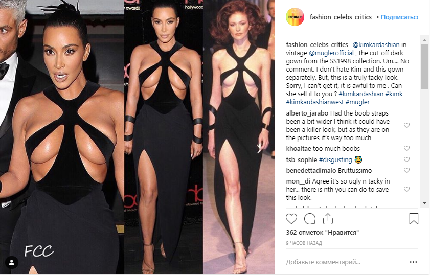 Снимок вызвал бурные обсуждения у поклонников, потому что откровенное платье Thierry Mugler прикрывает грудь лишь парой полосок. Отметим, что дизайнер впервые представил этот эскиз еще 20 лет назад - в весенней коллекции 1998 года.