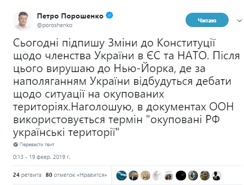 "Сегодня подпишу изменения в Конституцию относительно членства Украины в ЕС и НАТО", - сообщил Порошенко.