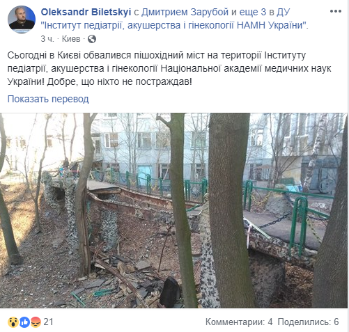 Сегодня, 19 февраля, на территории Института педиатрии, акушерства и гинекологии Национальной академии медицинских наук Украины по адресу ул. Платона Майбороди, 8 обвалился пешеходный мост. Об этом сообщил Александр Билетский в Facebook.