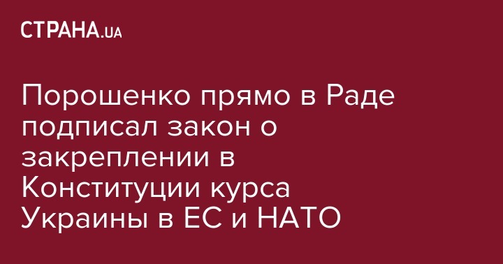 Президент Украины Петр Порошенко 19 февраля подписал закон о закреплении в Конституции стратегического курса Украины на членство в ЕС и в НАТО. Это произошло в сессионном зале Верховной Рады, передает "Гордон".