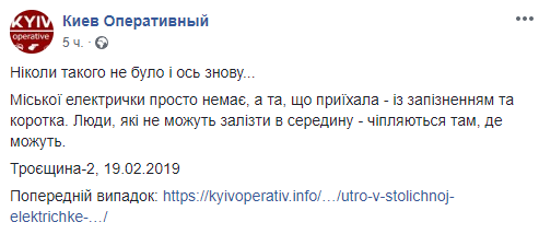 Во вторник, 19 февраля, в Киеве вновь начались проблемы с городской электричкой. Она пришла на станцию "Троещина-2" с опозданием, а все желающие не смогли в ней уместиться. Об этом на странице в Facebook сообщает "Киев Оперативный".