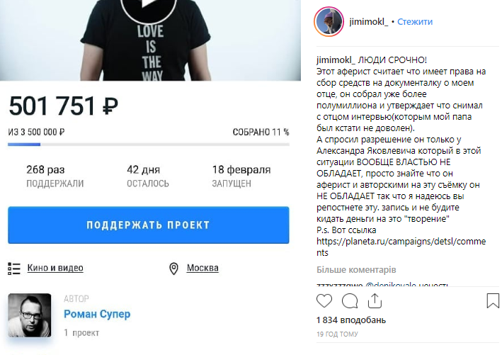 "Этот аферист считает что имеет права на сбор средств на документалку о моем отце, он собрал уже более полумиллиона и утверждает что снимал с отцом интервью (которым мой папа был кстати не доволен). А спросил разрешение он только у Александра Яковлевича который в этой ситуации вообще властью не обладает, просто знайте что он аферист и авторскими на эту съемку он не обладает", - написал в Instagram Антоний Толмацкий.