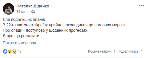 Напомним, до этого Диденко озвучила погоду в День памяти Небесной сотни в среду, 20 февраля. По ее словам, в этот день в Украину придет атмосферный фронт, который прикроет солнце облаками, а в Киеве пройдет небольшой дождь.