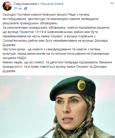 Следующие шаги - это комиссия по самоуправлению и комиссия по вопросам культуры, перед вынесением окончательного голосования на пленарном заседании КГГА. Надеемся, что все комиссии, и депутаты Киеврады поддержат желание общественности, и в Киеве появятся улицы Амины Окуевой и Джохара Дудаева", - написал Саид Исмагилов.