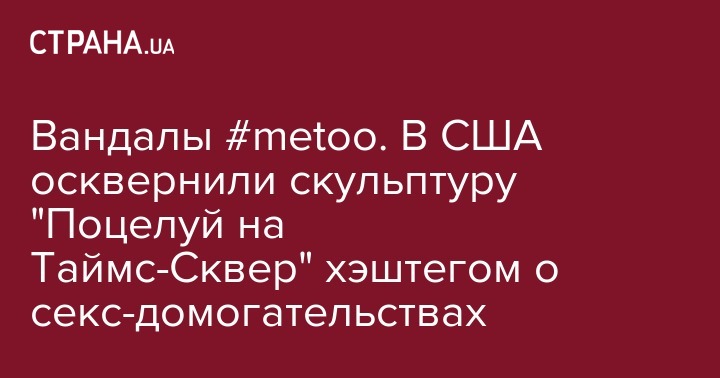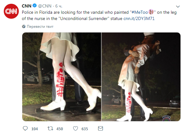 В ночь на вторник, 19 февраля, в городе Сарасота во Флориде неизвестные вандалы нанесли надпись #metoo на скульптуру, повторяющую сюжет легендарного снимка "Поцелуй на Таймс-Сквер", известие о смерти героя которого появилось в тот же день. Об этом сообщает New York Post