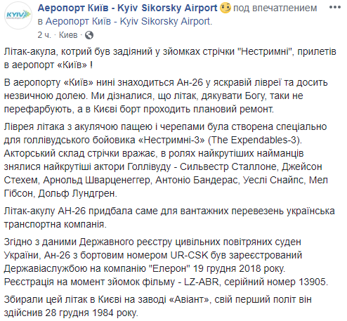 Сегодня, 20 февраля, в аэропорту Киева заметили самолет-акулу, который был задействован в съемках фильма "Неудержимые". Об этом сообщила пресс-служба аэропорта на своей странице в Facebook.