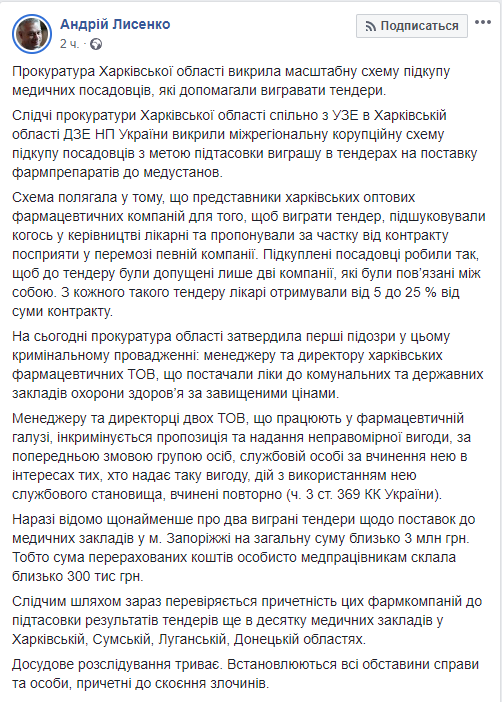 "Схема заключалась в том, что представители харьковских оптовых фармацевтических компаний для того, чтобы выиграть тендер, подыскивали кого-то в руководстве больницы и предлагали за долю от контракта помочь в победе определенной компании", - пишет он.