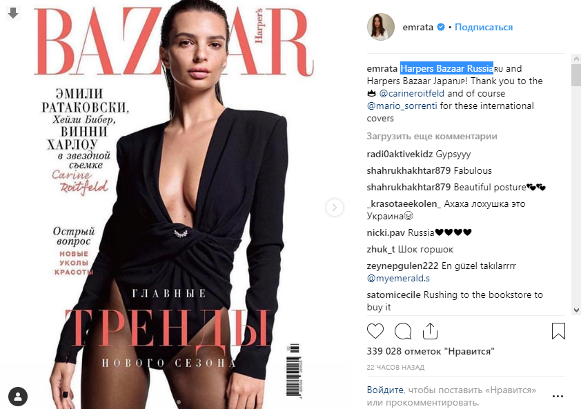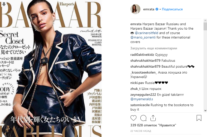 Американская модель и актриса Эмили Ратаковски снялась для обложки журнала Вazaar в двух странах, выложила их в свой Instagram, чем вызвала скандал и волну недовольство.