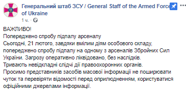 "Благодаря умелым действиям личного состава, пресечена попытка поджога на одном из арсеналов Вооруженных сил Украини. Угроза оперативно ликвидирована, без последствий. Продолжаются неотложные следственные действия правоохранительных органов", - говорится в сообщении.