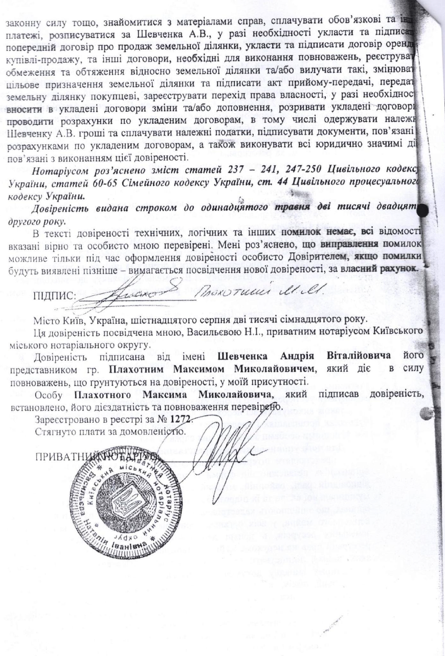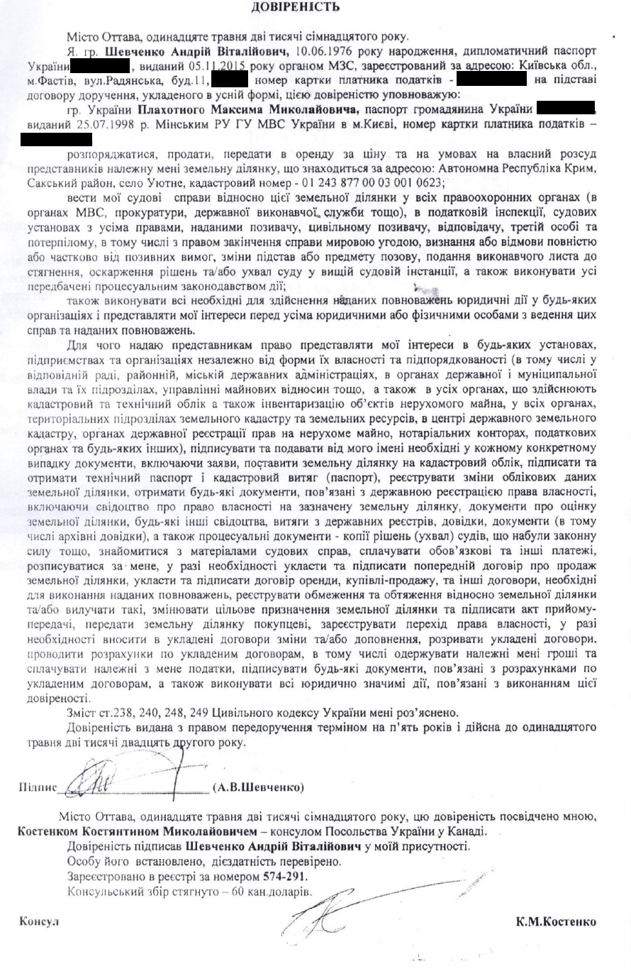Но он лгал. Ниже я публикую доверенность, которой Посол Шевченко прямо уполномочил своего помощника продать именно эту землю. Посол заверил её подальше от посторонних глаз у своего подчиненного - консула Украины в Канаде Костенко.