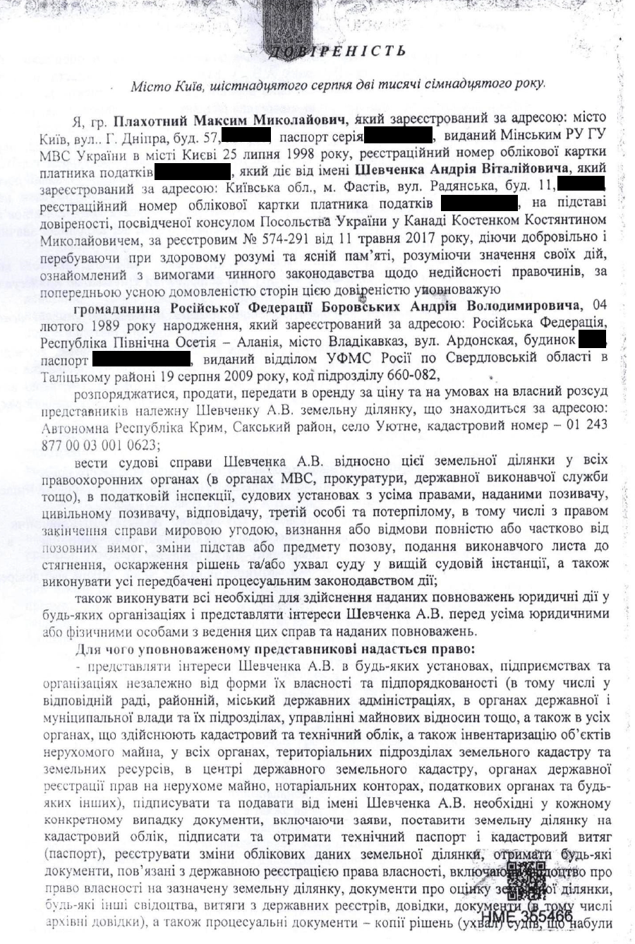 !Совокупность этих факторов и опубликованные документы доказывают, что подписывая доверенность именно на этот участок земли и уполномочивая на такую сделку своего персонального помощника в 2017 году, через три года после аннексии, Посол Шевченко действовал умышленно, организованной группой и из корыстных побуждений, точно зная, что в оккупированном Крыму такие сделки проводят российские нотариусы, по российским законам, в российских кадастрах и с платежами в российский бюджет", - считает Портнов.