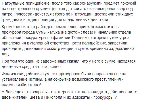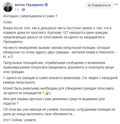 "Агитация с револьвером в сумке? Сумы. Вчера после того, как в дежурную часть поступил звонок о том, что в подвале дома по проспекту Курскому 127 находятся двое граждан, предлагающих деньги за голосование за одного из кандидатов в Президенты. На место немедленно выехал экипаж патрульной полиции, который обнаружил по этому адресу двух граждан - жителей Киева и Никополя - М. и Л. Патрульные полицейские, отрабатывая сообщение о возможном правонарушении попросили предъявить документы и осмотреть вещи этих граждан. У одного из граждан в сумке оказался револьвер", - рассказал нардеп и привел видеодоказательство.