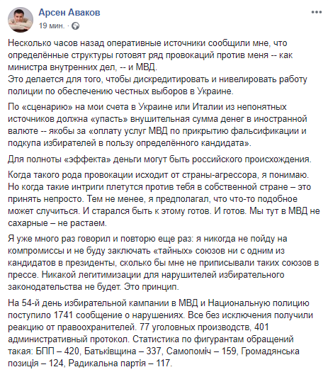 По словам главы МВД, на его счета в Украине или Италии из непонятных источников должна поступить внушительная сумма якобы за оплату услуг МВД по прикрытию фальсификации и подкупа избирателей в пользу определённого кандидата". Аваков подчеркнул, что "для полноты эффекта" деньги могут быть российского происхождения.