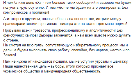 По информации министра внутренних дел, на 54-й день избирательной кампании в МВД и Национальную полицию поступило 1741 сообщение о нарушениях. Открыто 77 уголовных производств, составлен 401 административный протокол. Статистика по фигурантам обращений такая: БПП – 420, Батьківщина – 337, Самопоміч – 159, Громадянська позиція – 124, Радикальна партія – 117.