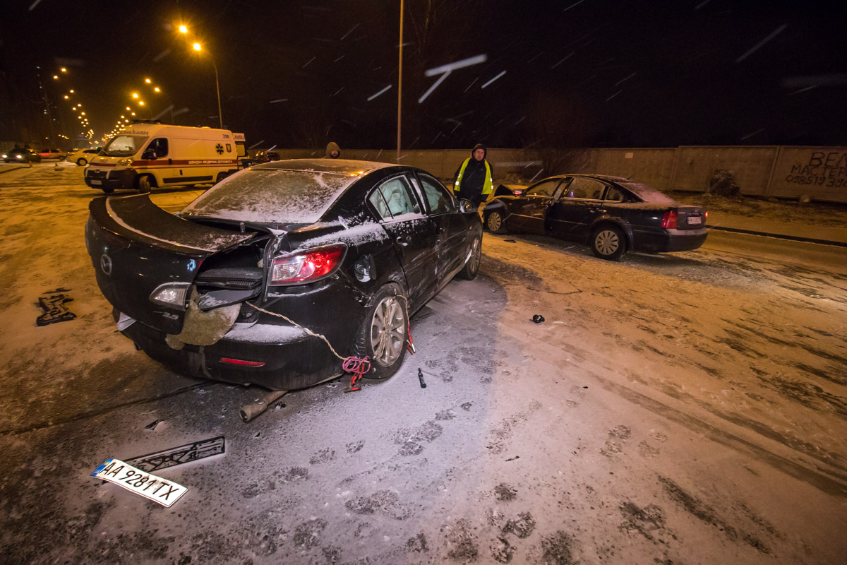 По словам водителя Volkswagen, он двигался по Здолбуновской в сторону Днепровской набережной, а Mazda ехала в противоположном направлении. Во время движения Mazda врезалась в Toyota и после этого отлетела в Volkswagen.