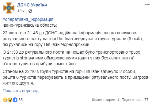 Как рассказали спасатели, 22 февраля в 21:30 на поисково-спасательный пост на горе Поп Иван Черногорский обратилась группа из восьми туристов. "В 21:30 в спасательный пост на носилках были транспортированы трое туристов со значительными обморожениями (один из них без признаков жизни), пятеро туристов прибыли самостоятельно. По состоянию на 22:10 из группы туристов на горе Поп Иван погибли 2 человека", - сообщили в Госслужбе Украины по чрезвычайным ситуациям.