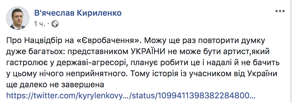 Вице-премьер Вячеслав Кириленко еще днем опубликовал твит, в котором выразил мнение, что Украину на Евровидении не может представлять участник, который ездит с гастролями в Россию. И сказал, что история с отбором "еще далека от завершения". А уже после голосования повторил этот пост дословно на Facebook, что можно воспринимать как прямой намек – Maruv могут не пустить на конкурс от Украины волевым решением властей.