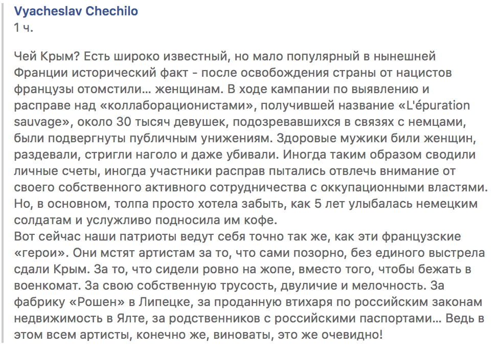 Вот сейчас наши патриоты ведут себя точно так же, как эти французские "герои". Они мстят артистам за то, что сами позорно, без единого выстрела сдали Крым. За то, что сидели ровно на жопе, вместо того, чтобы бежать в военкомат. За свою собственную трусость, двуличие и мелочность. За фабрику "Рошен" в Липецке, за проданную втихаря по российским законам недвижимость в Ялте, за родственников с российскими паспортами… Ведь в этом всем артисты, конечно же, виноваты, это же очевидно!".