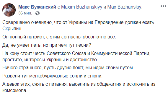 "Совершенно очевидно, что от Украины на Евровидение должен ехать Скрыпин. Он полный патриот, с этим согласны абсолютно все.