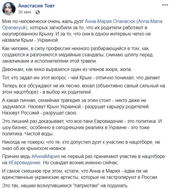 "Мне по-человечески очень жаль дуэт Анна-Мария Опанасюк (Anna-Maria Opanasyuk), которых загнобили за то, что их родители работают в оккупированном Крыму. И за то, что они в одном интервью четко не назвали Крым – Украиной.