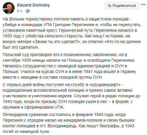 В Волынской области поставили крест "нацистскому полицаю, убийце и командиру УПА Григорию Перегиняке". Об этом говорится на Фейсбук-странице главы украинского Еврейского комитета Эдуарда Долинского в воскресенье, 24 февраля.