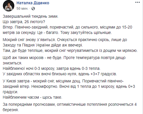 Мокрый снег ожидается практически везде, только к западу и югу Украины осадки дойдут вечером. Там, где будет теплее, мокрый снег будет чередоваться с дождем или туманом. Ближайшей ночью ожидается 0...3 мороза, завтра днем ​​0...+3 тепла. В западных областях ночью около нуля, днем ​​+3...+7 градусов.