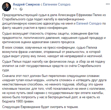 Председательствующий судья в деле Александра Ефремова Александр Пелих из Старобельского суда, в отводе которого было отказано в середине января, подал жалобу в квалификационно-дисциплинарную комиссию адвокатуры на защитников бывшего руководителя фракции Партии регионов за их участие в пресс-конференции о рассмотрении дела. Об этом адвокат Андрей Смирнов написал на своей странице в Facebook.
