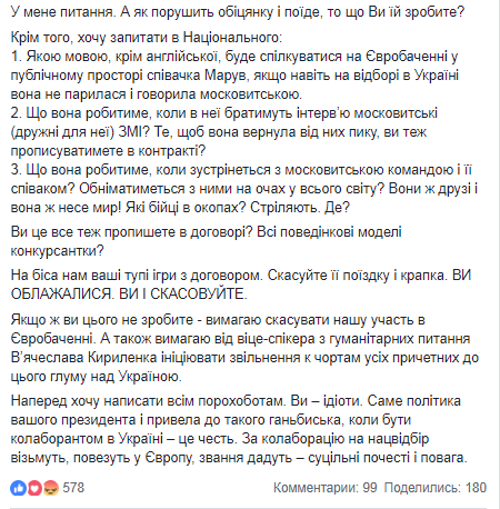 "На кой черт нам ваши тупые игры с договором. Отмените ее поездку и точка. Вы облажались. Вы И отменяйте. Если же вы этого не сделаете - требую отменить наше участие в Евровидении. А также требую от вице-спикера по гуманитарным вопросам Вячеслава Кириленко инициировать увольнение к чертям всех причастных к этому глумлению над Украиной. Заранее хочу написать всем порохоботам. Вы - идиоты. Именно политика вашего президента и привела к такому позорищу...", - написала Лариса Ницой.