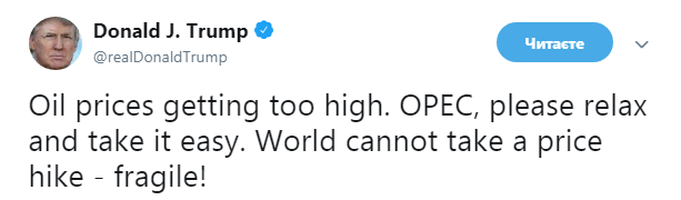 "Цены на нефть растут слишком сильно. ОПЕК (Организация стран-экспортеров нефти - прим. ред.), расслабься. Мир слишком хрупок, чтобы вынести такие ценовые скачки", - говорится в публикации Трампа.