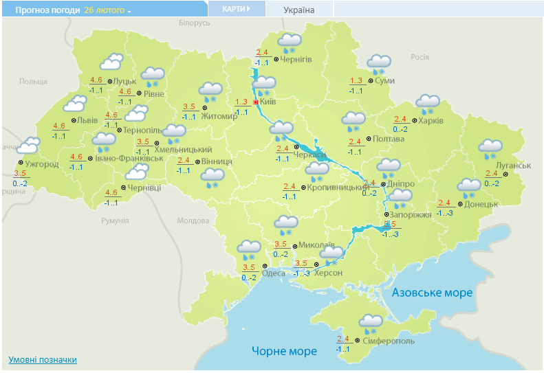 По прогнозу Укргидрометцентра погода в Украине во вторник, 26 февраля, будет облачной. В ряде регионов страны ожидаются снегопады. Ночью столбики термометров покажут от -3 в центральных и западных областях до -3 на юге Украины.