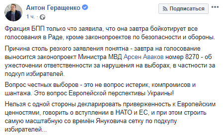 "Фракция БПП только что заявила, что она завтра бойкотирует все голосования в Раде, кроме законопроектов по безопасности и обороны. Причина столь резкого заявления понятна - завтра на голосование выносится законопроект Министра МВД Арсена Авакова номер 8270 - об ужесточении ответственности за нарушения на выборах, в частности за подкуп избирателей", - написал Геращенко.