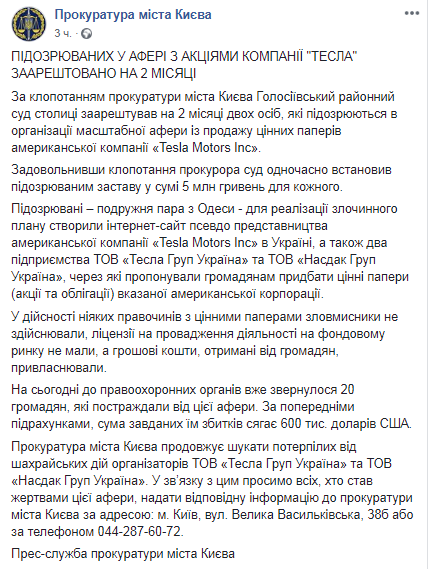 В понедельник, 25 февраля, Голосеевский райсуд Киева избрал меру пресечения двоим мошенникам, которые обманывали украинцев, якобы продавая им американской компании Tesla Motors Inc. Об этом сообщает пресс-служба прокуратуры Киева на своей странице в Facebook.