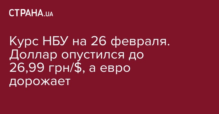 Нацбанк Украины (НБУ) установил официальный курс основных валют по отношению к гривне на вторник, 26 февраля. Сегодня курс доллара составил 26,99 грн/доллар, что на 2 копейки ниже по сравнению с предыдущим банковским днем. Об этом свидетельствует информация на сайте регулятора.