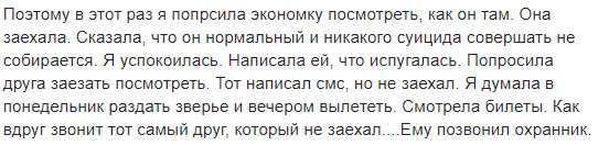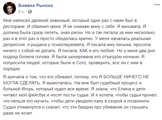 "Я писала, КАК я его люблю. Но у меня два дня подряд болела голова. Я была шокирована его отъездом ночным. Я попросила людей, которые были в Сото, проверить, все ли с ним в порядке. Я кричала о том, что его убивают, потому, что Я БОЛЬШЕ НИЧЕГО НЕ МОГЛА СДЕЛАТЬ. Я вымоталась. На мне был судебный процесс и больной Игорь, который чудил все время....", - добавила она.