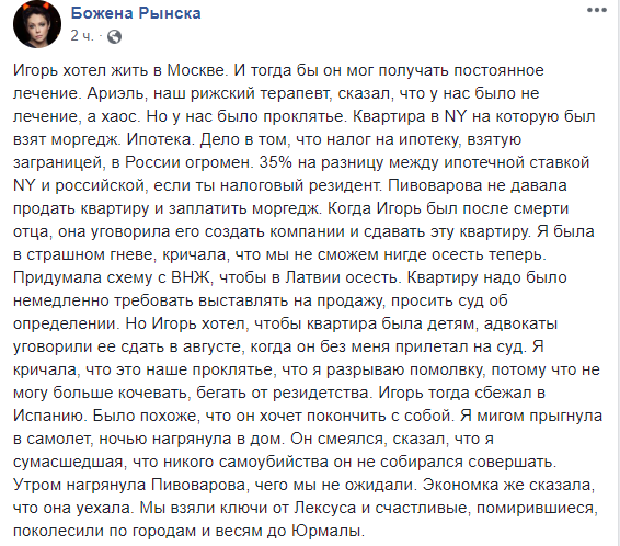 Также Божена Рынска отметила, что Игорь хотел жить в Москве, чтобы получать постоянное лечение... "Игорь тогда сбежал в Испанию. Было похоже, что он хочет покончить с собой. Я мигом прыгнула в самолет, ночью нагрянула в дом. Он смеялся, сказал, что я сумасшедшая, что никакого самоубийства он не собирался совершать...", - вспоминает журналистка о предыдущих опасениях о неладном.