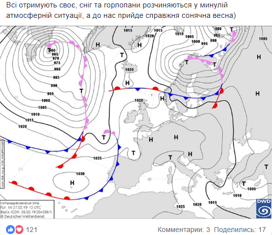 Ближайшей ночью, 27 февраля, ожидается от +2 до -3 мороза, днем +​​1...+5 градусов, на Закарпатье +3...+8 градусов. Все время будет задувать холодный ветер, который угомонится аж в субботу-воскресенье. Также синоптик посоветовала не поддаваться ни серой погоде, ни серым людям, как бы они не горлопанили, потому что это всегда проходит.