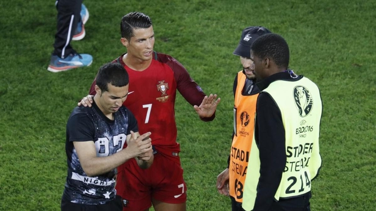 После финального свистка в матче группового турнира Евро-2016 между сборными Португалии и Австрии (0:0) на поле выбежал болельщик, который хотел сделать селфи со своим кумиром - капитаном сборной Португалии Криштиану Роналду. Об этом сообщает ua-football.