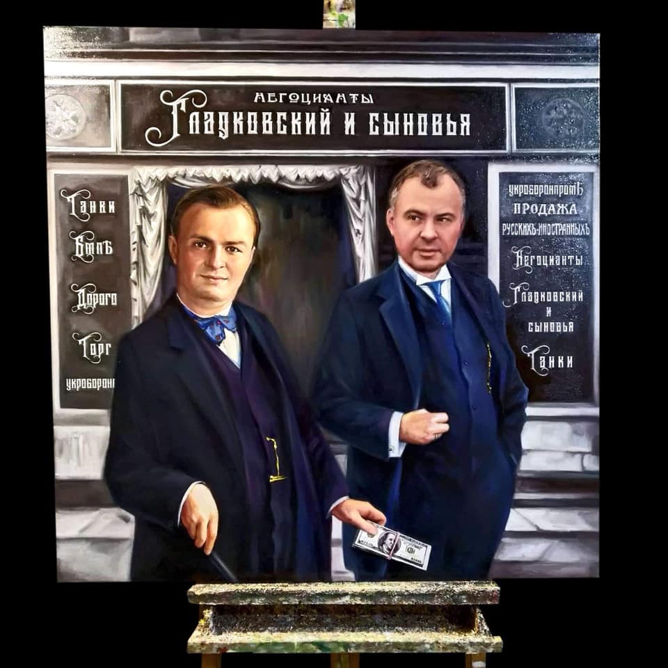На полотне изображены люди, похожие на друзей Петра Порошенко: замсекретаря СНБО Олега Гладковского и его сына Игоря Гладковского, которые оказались замешаны в громком скандале с закупкой запчастей в России и махинациях в оборонпроме.  Они стоят под вывеской "Негоцианты Гладковский и сыновья", а слева и спрва красуются вывески: Танки,  Дорого, Укроборонмпром, Продажа русских иностранных и проч. В руках более молодого героя картины  - волшебная палочка и пачка долларов.