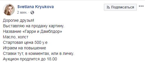 "Название "Гарри и Дамблдор". Масло, холст. Стартовая цена 500 у.е", - говорится в сообщении Крюковой. Аукцион продлится до 18:00.