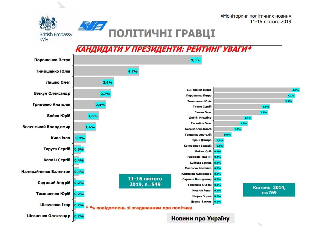 Больше всего в новостях упоминался Петр Порошенко, на долю которого пришлось 9,3% эфирного времени новостных выпусков на центральном телевидении. Затем со значительным отрывом идут Юлия Тимошенко, Олег Ляшко, Александр Вилкул и Анатолий Гриценко.