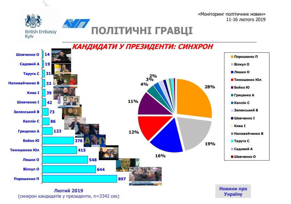 "Речь идет не об упоминании кандидатов, а когда они просто говорят сами. Эти показатели не совпадают. Например, на НТКУ упоминают Петра Порошенко, но синхронов его нет. И каналы довольно сегментированы по этому показателю", - подчеркнула она.