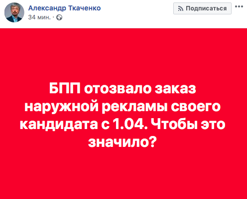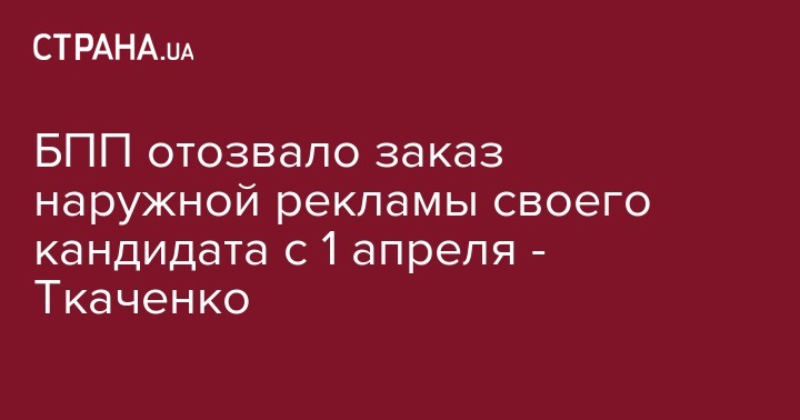 Блок Петра Порошенко отозвал заказ наружной рекламы своего кандидата с 1 апреля. Об этом на своей странице в Facebook сообщил генеральный директор "1+1" Александр Ткаченко.