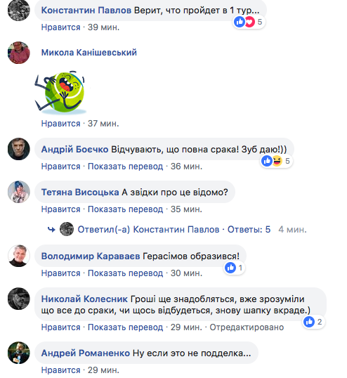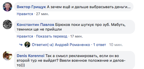 В комментариях к посту пишут: "Чувствуют, что полная ж@па", "А зачем еще дальше деньги выбрасывать", "А смысл рекламировать, если он не пройдет во второй тур".