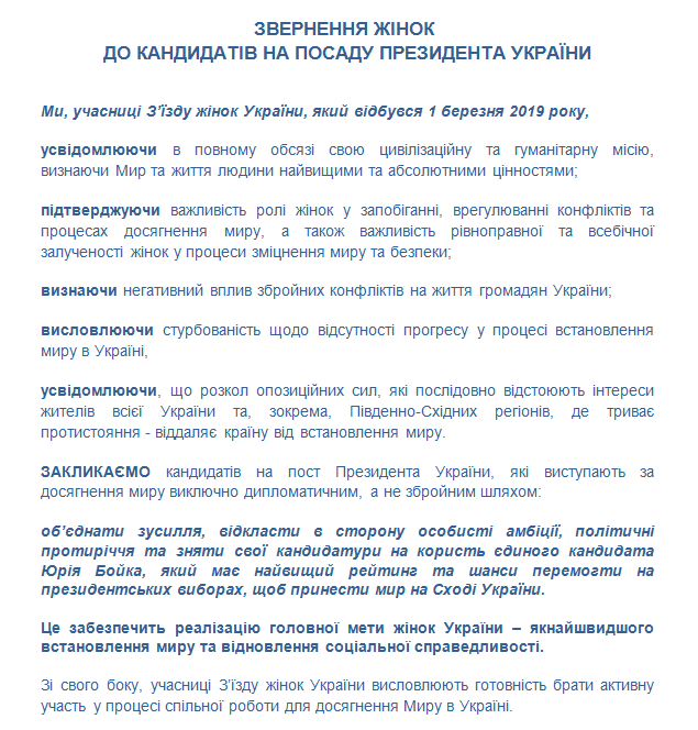 "Сегодня женщины, представляющие все регионы страны, обратились к кандидатам в президенты Украины с призывом объединить усилия, отложить в сторону все политические амбиции, противоречия и снять свои кандидатуры в пользу единого кандидата Юрия Бойко, который имеет наивысший рейтинг и шансы на победу, чтобы как можно быстрее вернуть мир в Донбасс. Для женщин – это будет лучшим подарком на 8 марта", – заявила инициатор Национальной платформы "Женщины за Мир" Наталия Королевская.