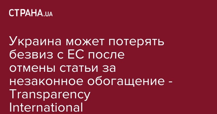 В международной организации Transparency International заявили, что граждане Украины рискуют потерять безвизовый режим с ЕС после отмены ответственности за незаконное обогащение. Об этом сообщает официальный сайт организации.