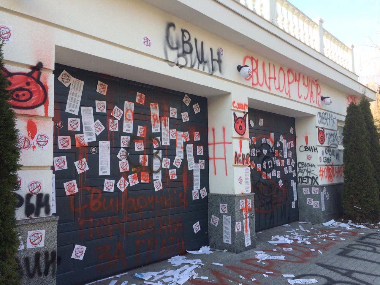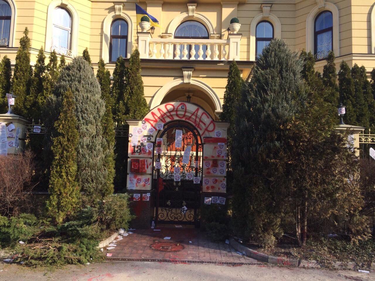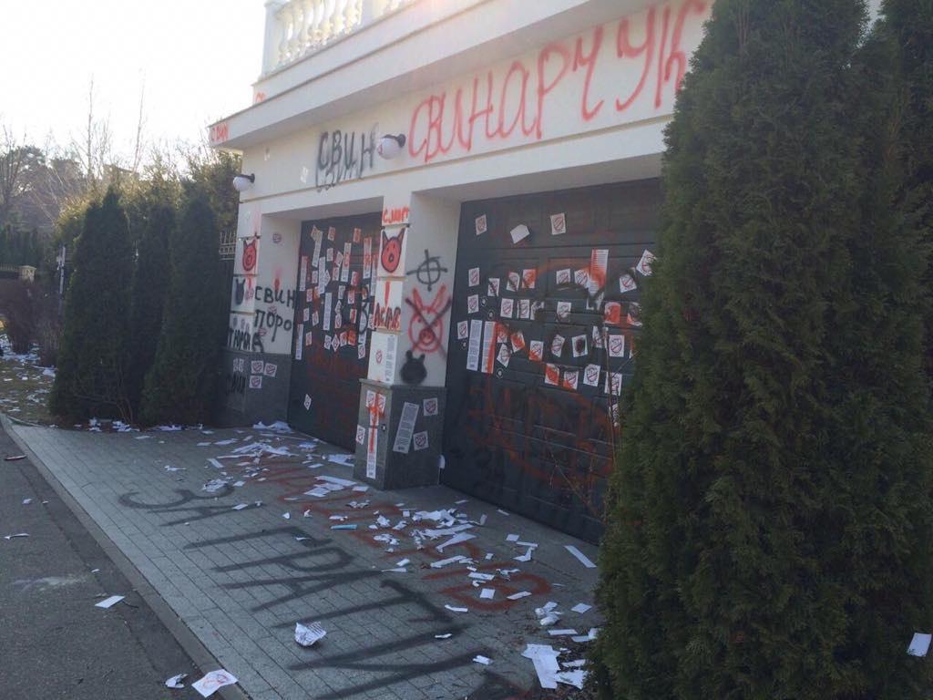 Ранее мы писали о том, что среди участников было около 1000 человек, впрочем, они проанонсировали более масштабную акцию протеста 9 марта на Майдане Независимости в Киеве. На особняке Гладковского написали: "Мародер", "Свинарчук", "Свинарчуков Порошенко - за решетку", "Свинарчука за решетку"  (Свинарчук - бывшая фамилия заместителя секратеря СНБО Олега Гладковского).